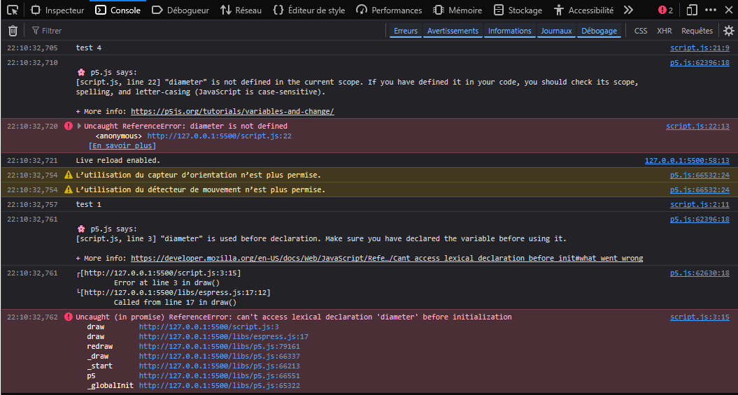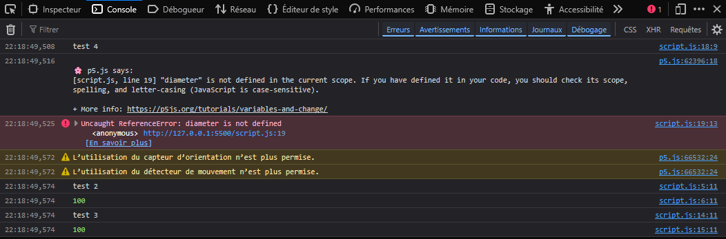 Donc dans la réponse au dernier exercice, diameter et distance sont créées au début de la fonction draw() et n'existe que dans la fonction draw(). On peut essayer avec plusieurs console.log() pour essayer d'afficher diameter à plusieurs endroits.