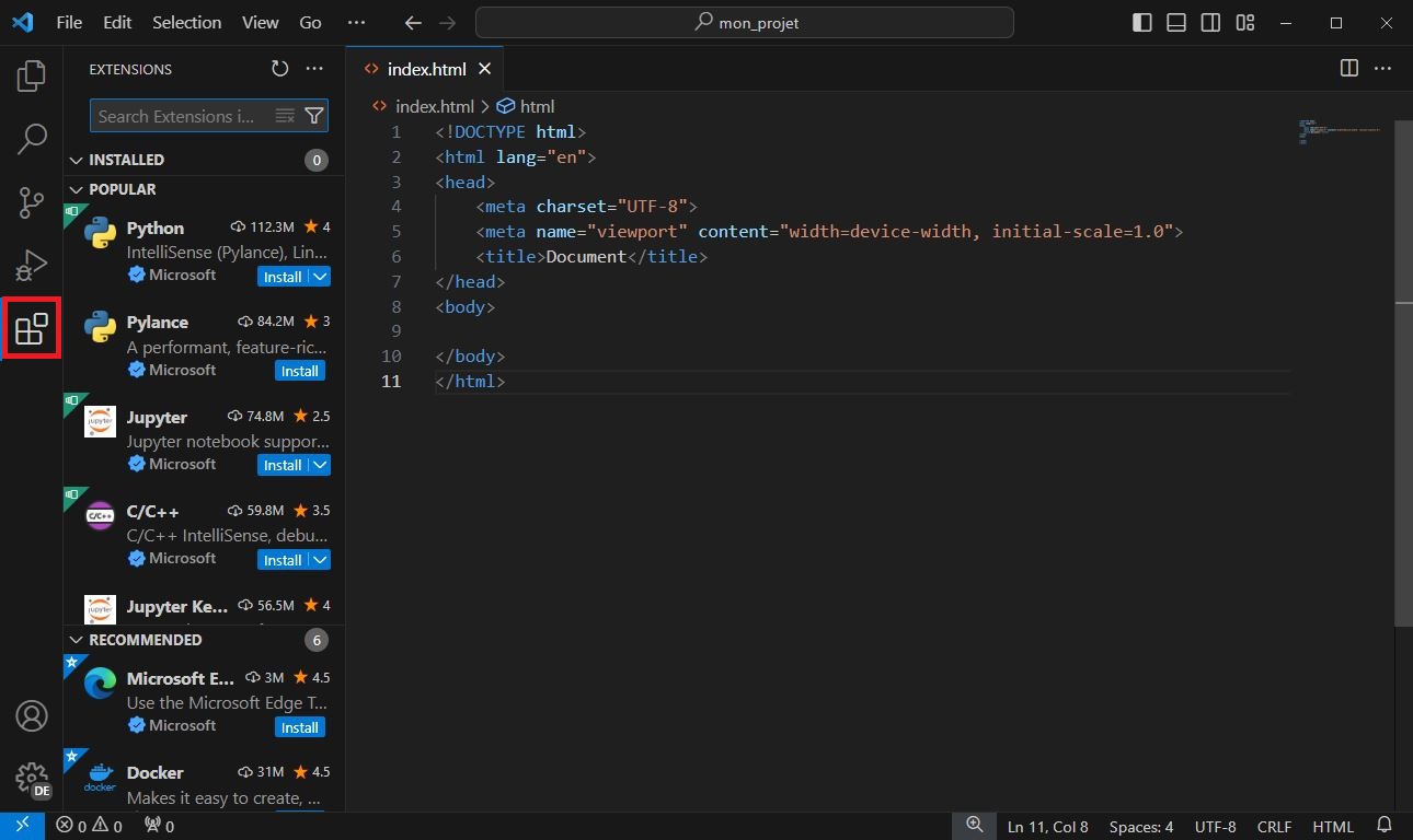 Fermez l'onglet de l'extension maintenant qu'elle est installee et cliquez sur l'explorer pour revenir à la vue de travail.